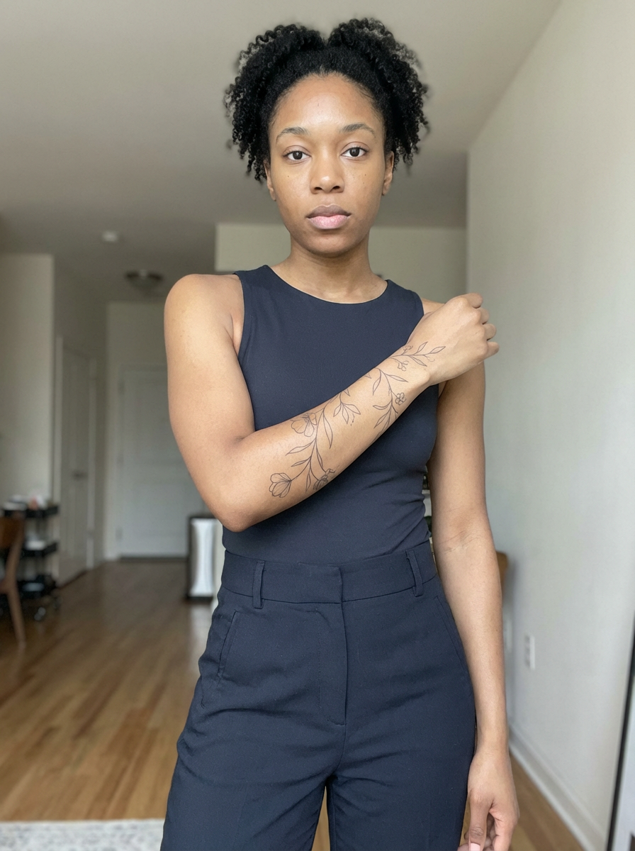 Model with a minimalist fine-line tattoos on the arm and wrist. Elegant floral design wrapping around the forearm . Subtle and stylish body art.