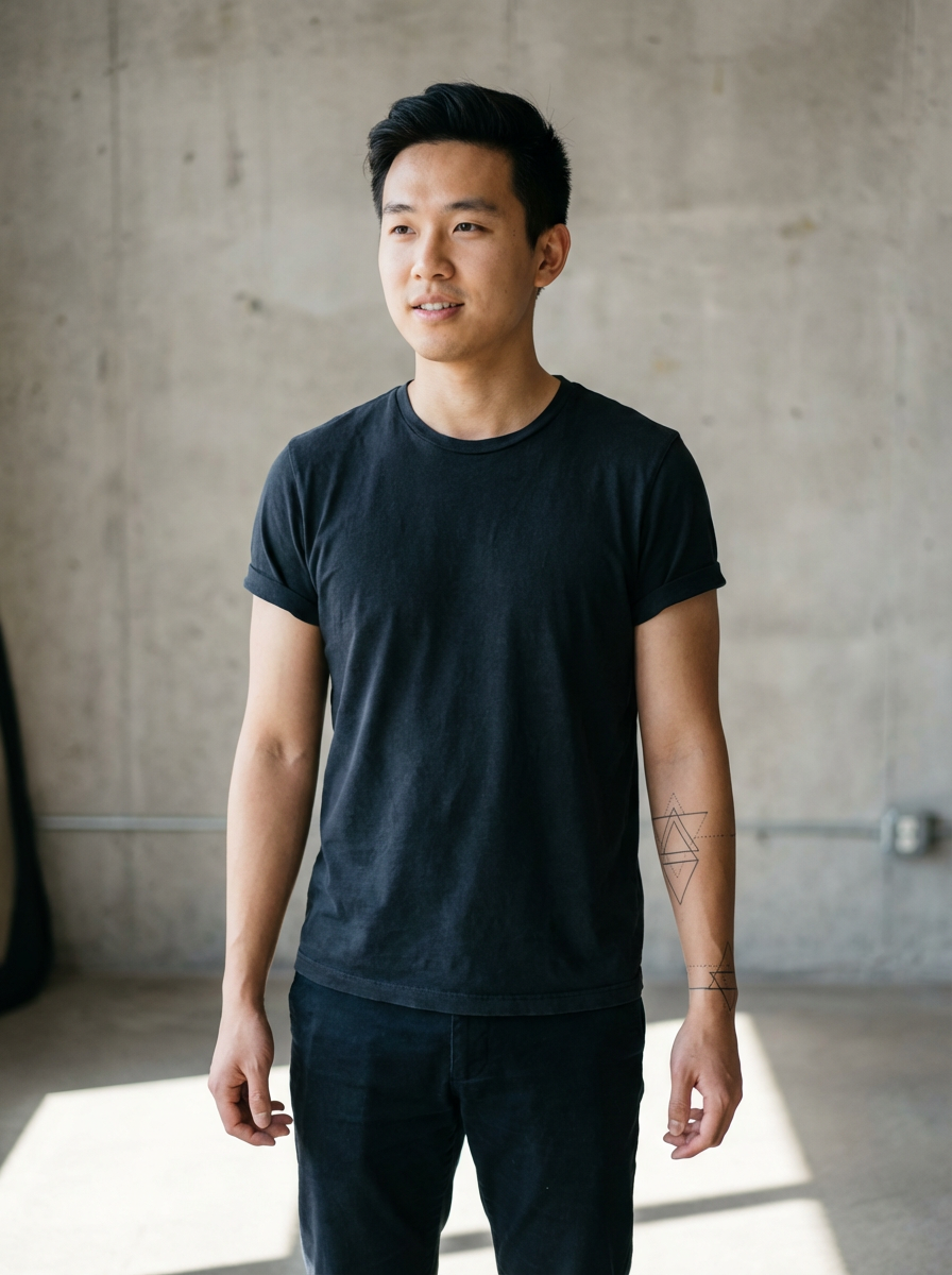 Model with a minimalist fine-line tattoos on the arm and wrist. Geometric minimalist tattoo. Subtle and stylish body art.