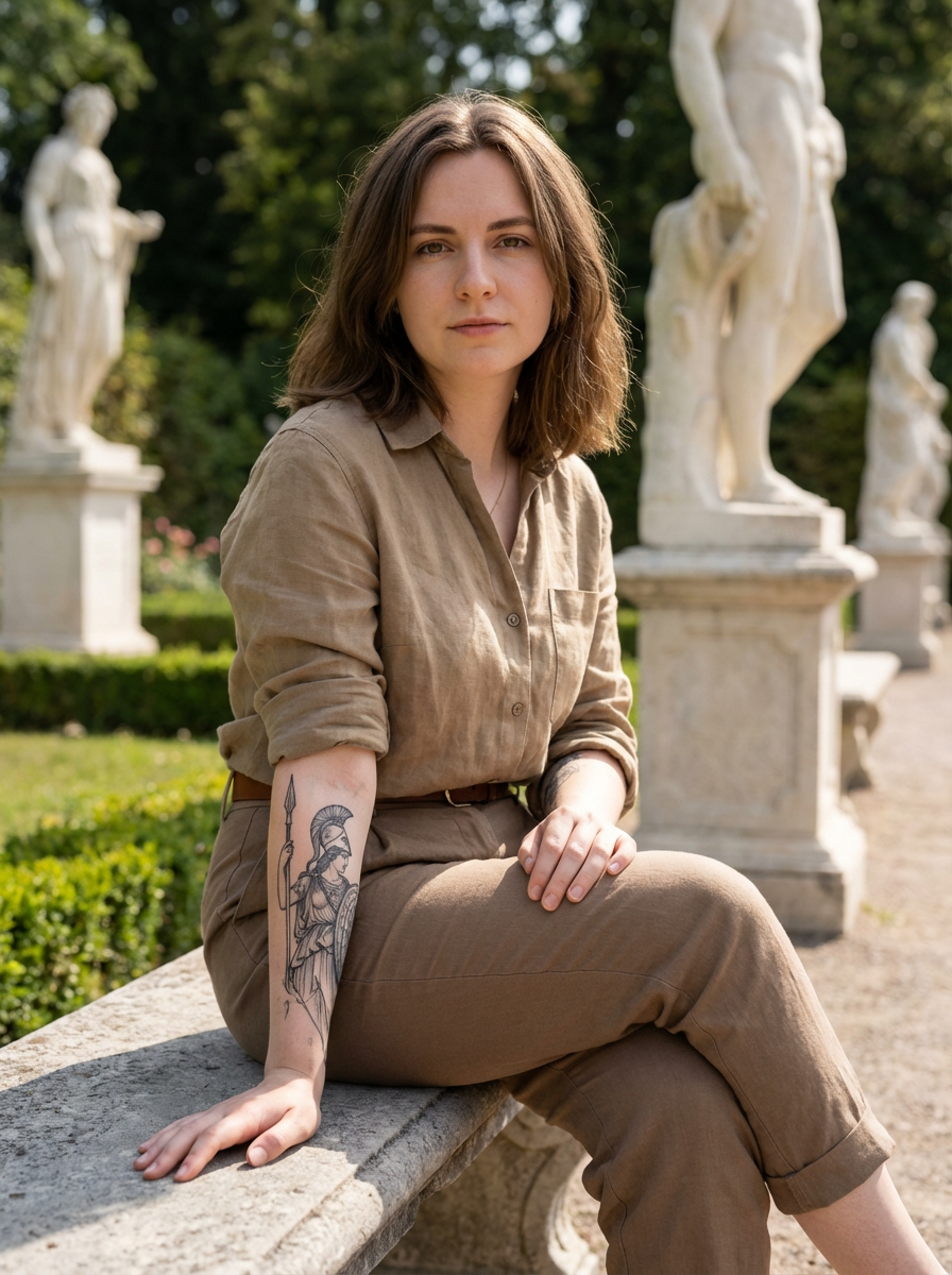 Model with a mythological tattoo inspiration. Greek goddess Athena tattooed on the forearm, finely detailed . Renaissance art inspiration.