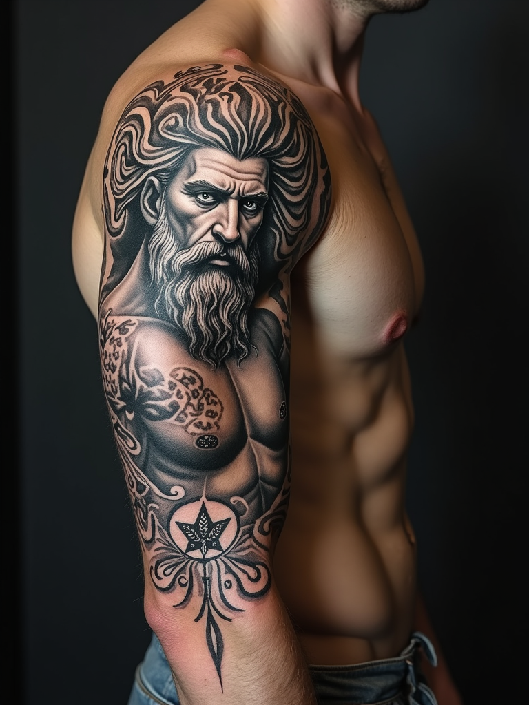 Model with a mythological tattoo inspiration. Odin or Zeus tattoo sleeve, highly detailed. Renaissance art inspiration.