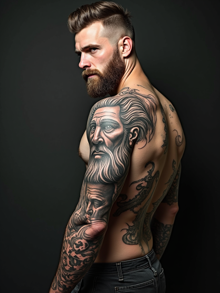 Model with a mythological tattoo inspiration. Odin or Zeus tattoo sleeve, highly detailed. Renaissance art inspiration.