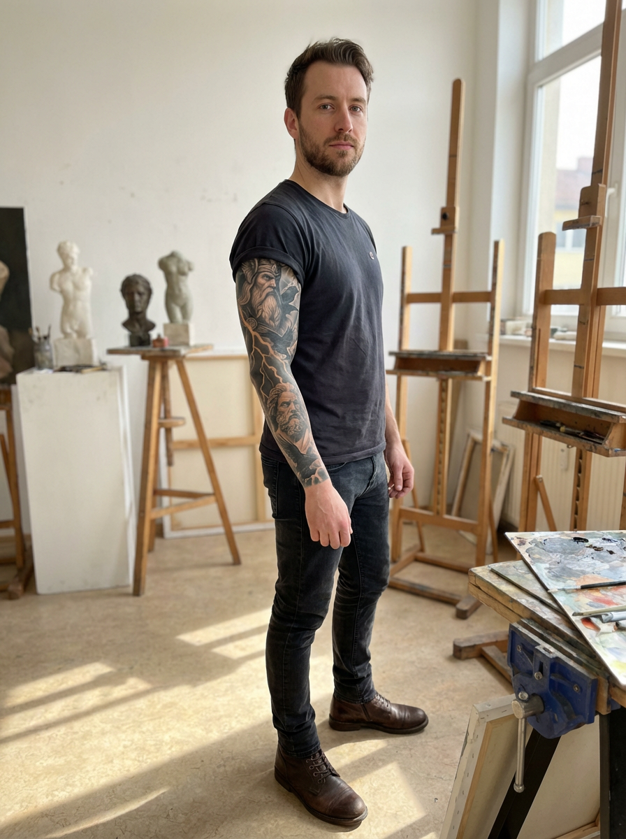 Model with a mythological tattoo inspiration. Odin or Zeus tattoo sleeve, highly detailed. Renaissance art inspiration.