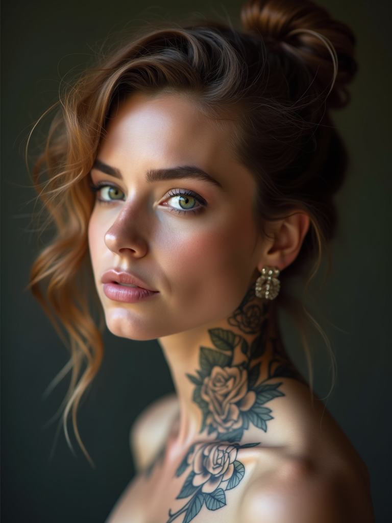 Model with a neck tattoo focus, bold statement ink. Elegant script or rose tattoo on the side of the neck . Strong, confident expression.