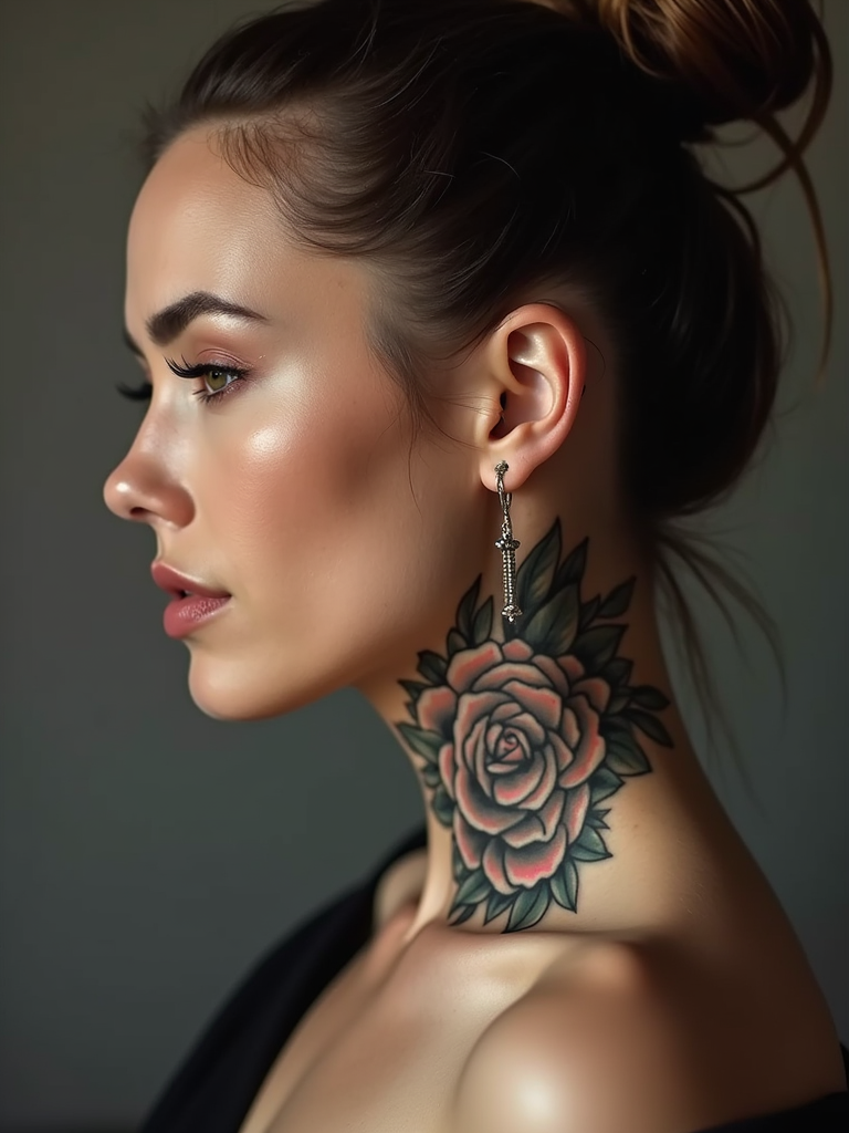 Model with a neck tattoo focus, bold statement ink. Elegant script or rose tattoo on the side of the neck . Strong, confident expression.