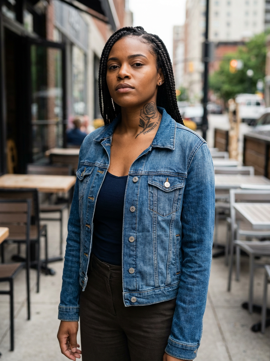 Model with a neck tattoo focus, bold statement ink. Elegant script or rose tattoo on the side of the neck . Strong, confident expression.
