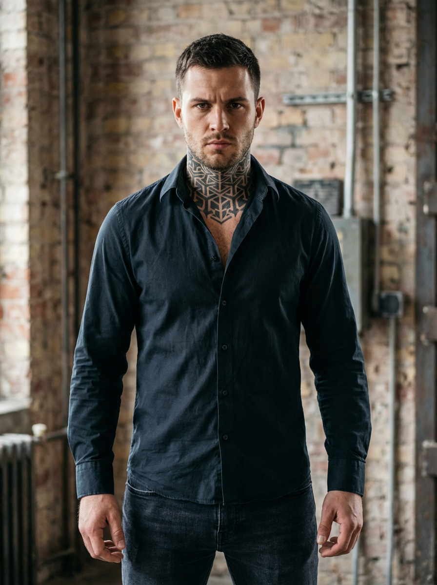 Model with a neck tattoo focus, bold statement ink. Intense geometric tattoo spanning the throat and shoulders. Strong, confident expression.