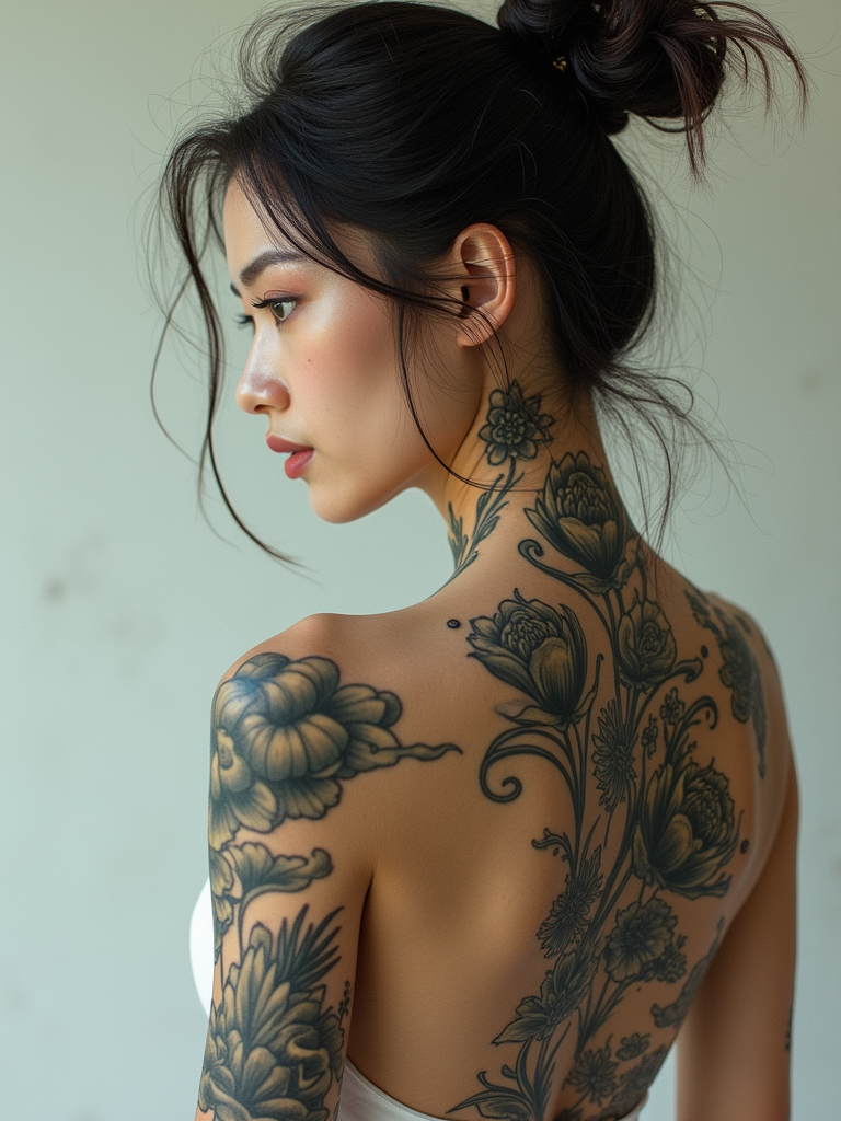 Model with a surrealist tattoo aesthetic. Dreamy cloud-like tattoos on the back, floating imagery . Mind-bending design.