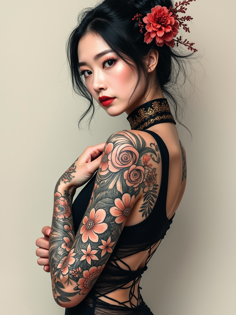 Model with a tattoo sleeve concept. Blackwork sleeve with floral and ornamental details . Highly detailed.