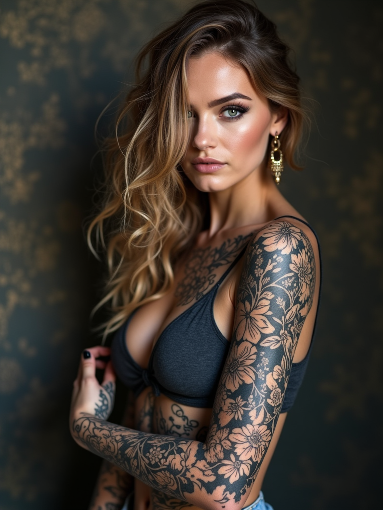 Model with a tattoo sleeve concept. Blackwork sleeve with floral and ornamental details . Highly detailed.