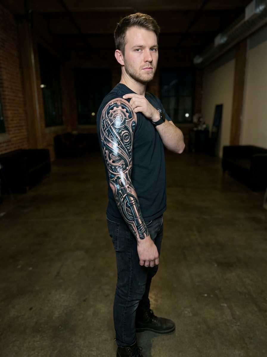 Model with a tattoo sleeve concept. Full-arm biomechanical sleeve, metallic glossy ink effect. Highly detailed.