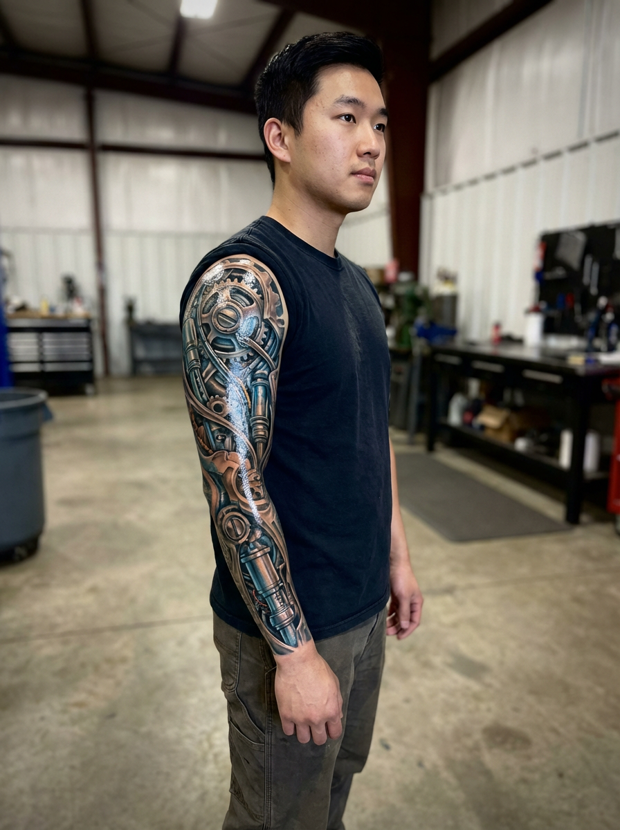 Model with a tattoo sleeve concept. Full-arm biomechanical sleeve, metallic glossy ink effect. Highly detailed.