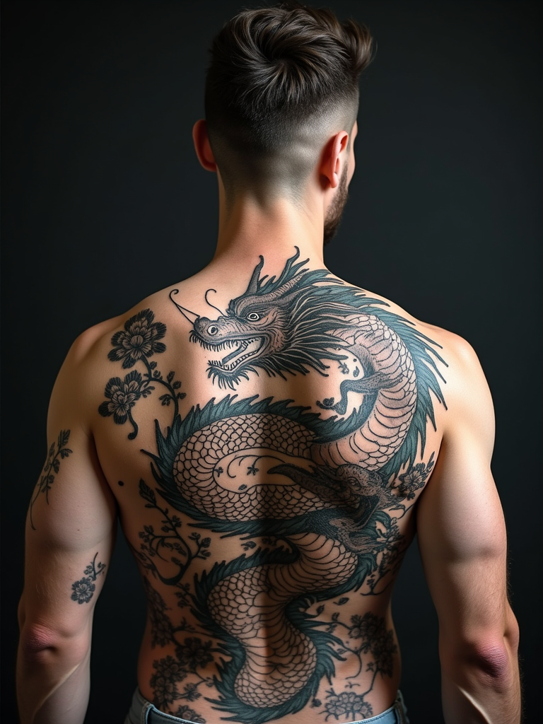 Model with a traditional Japanese tattoos covering the back and shoulders. Full-back dragon tattoo. Artistic realism.