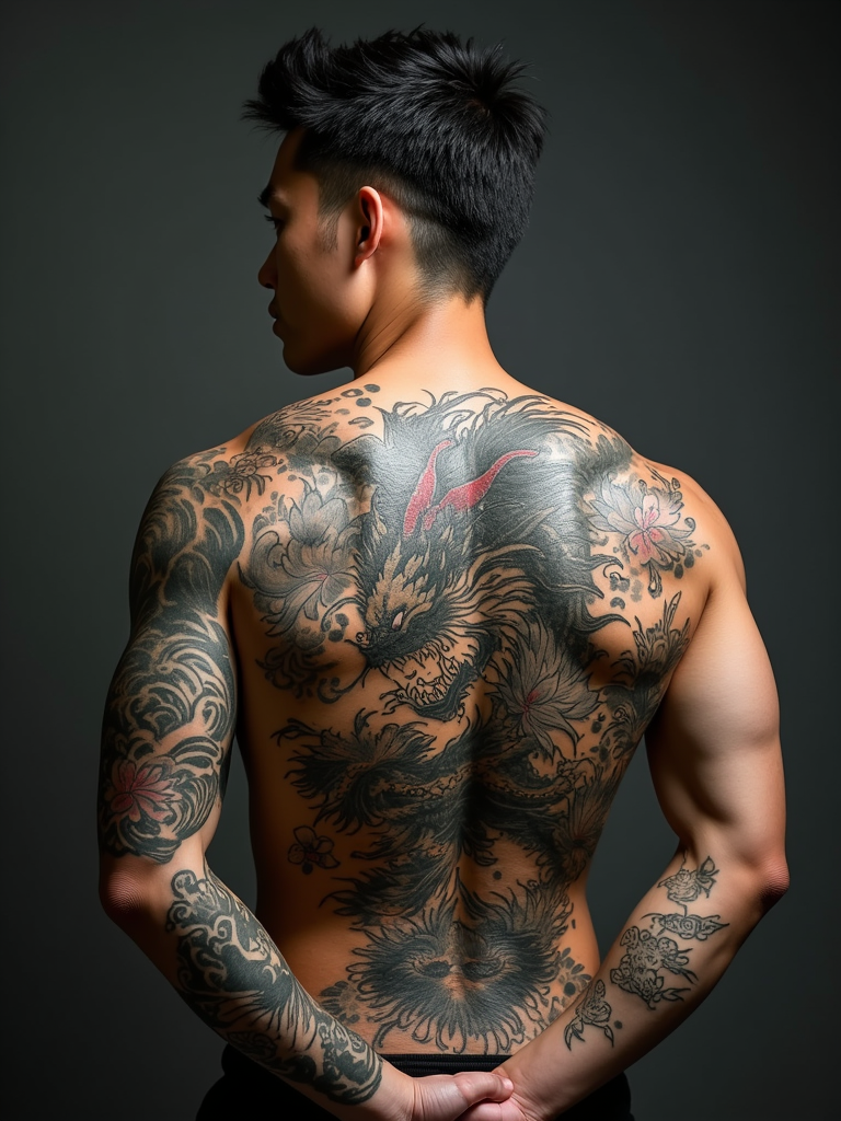 Model with a traditional Japanese tattoos covering the back and shoulders. Full-back dragon tattoo. Artistic realism.