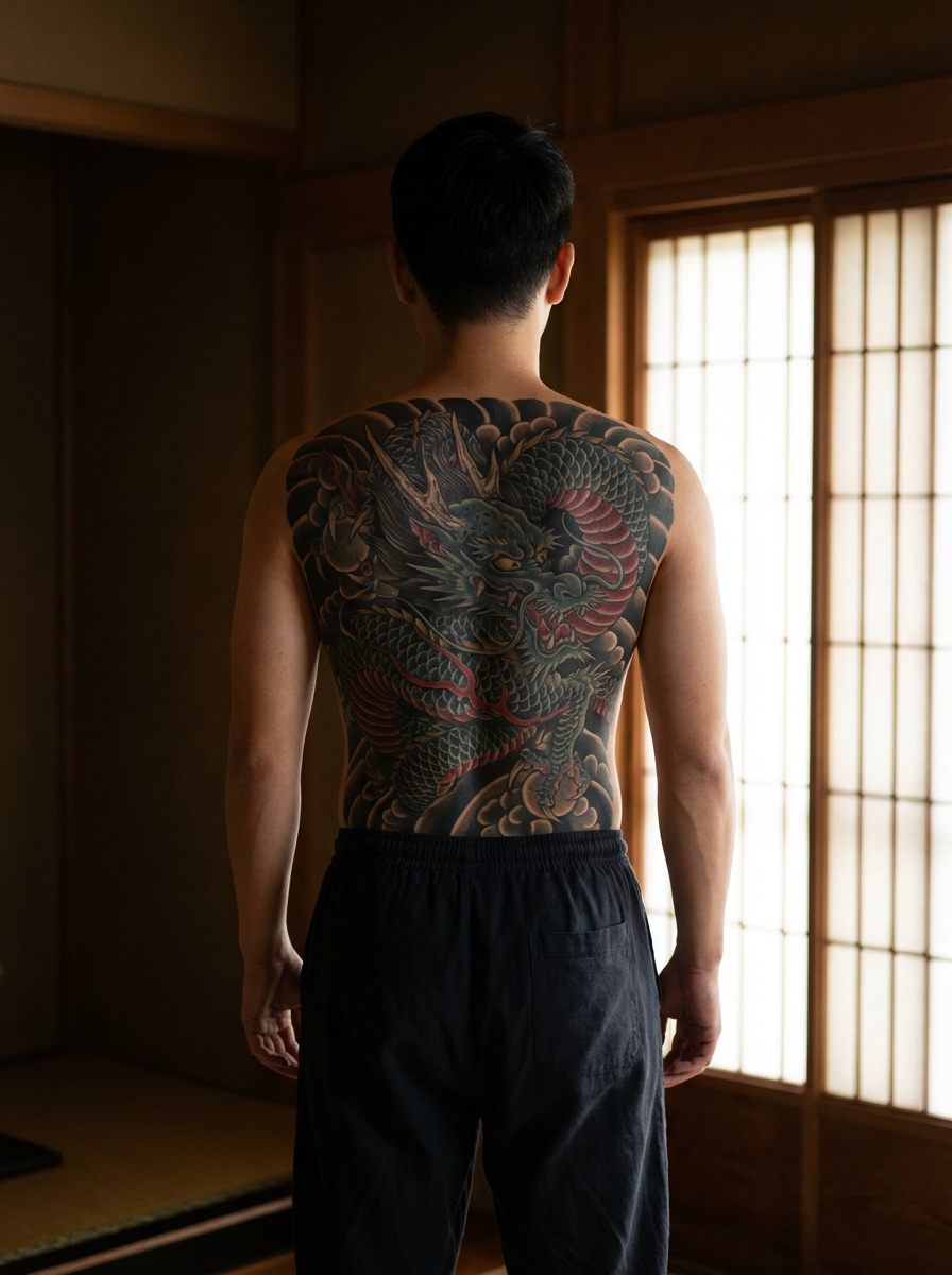 Model with a traditional Japanese tattoos covering the back and shoulders. Full-back dragon tattoo. Artistic realism.