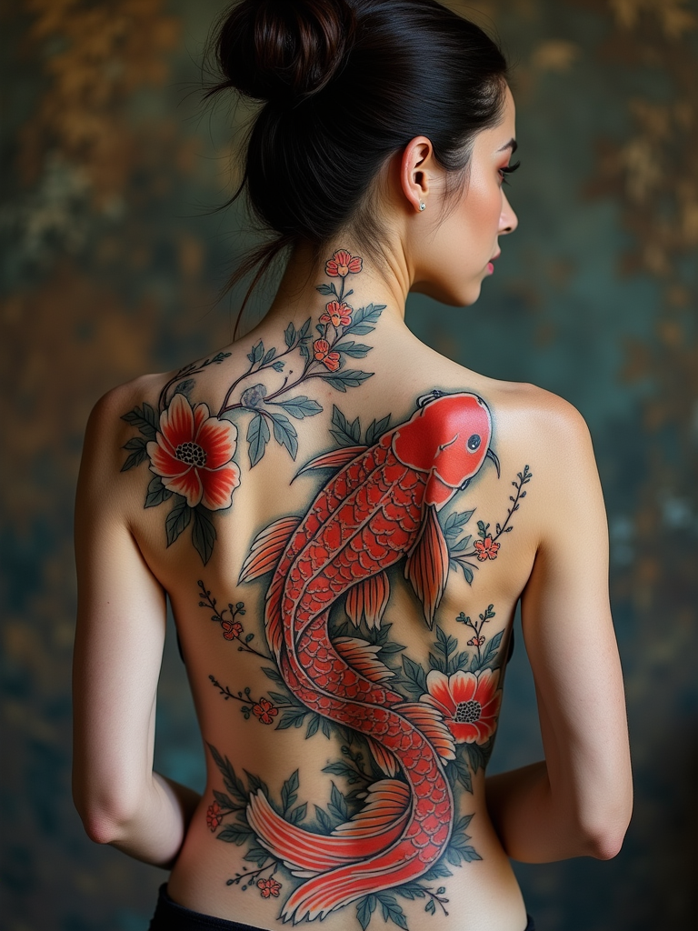 Model with a traditional Japanese tattoos covering the back and shoulders. Intricate koi fish and cherry blossom tattoo . Artistic realism.