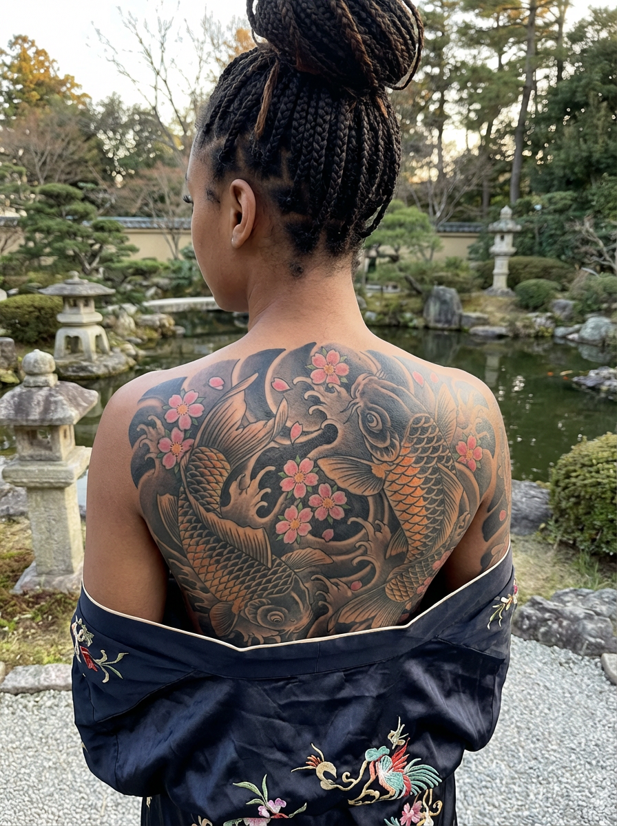 Model with a traditional Japanese tattoos covering the back and shoulders. Intricate koi fish and cherry blossom tattoo . Artistic realism.
