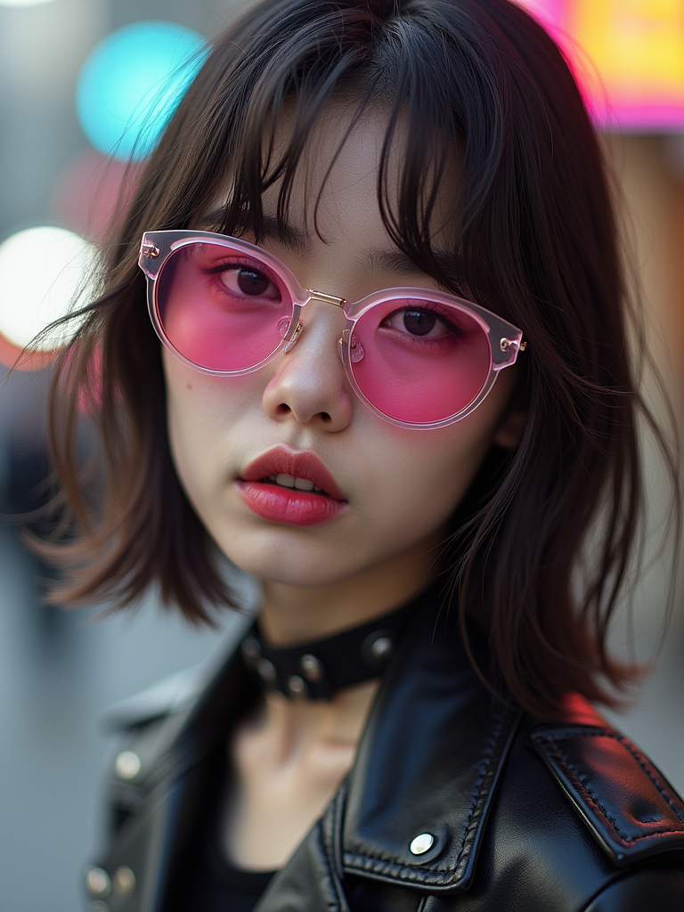 Model with alternative fashion, edgy attitude, street photography vibes. Pink-tinted glasses, dark choker, expressive pose . TikTok and Instagram style.
