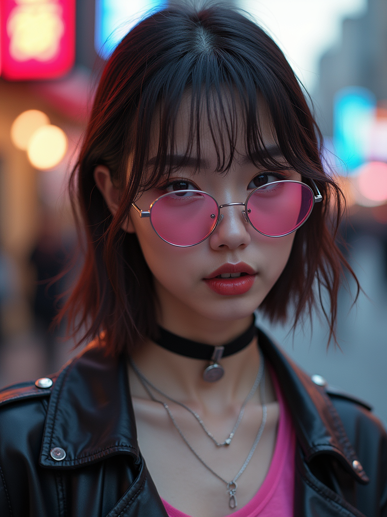 Model with alternative fashion, edgy attitude, street photography vibes. Pink-tinted glasses, dark choker, expressive pose . TikTok and Instagram style.