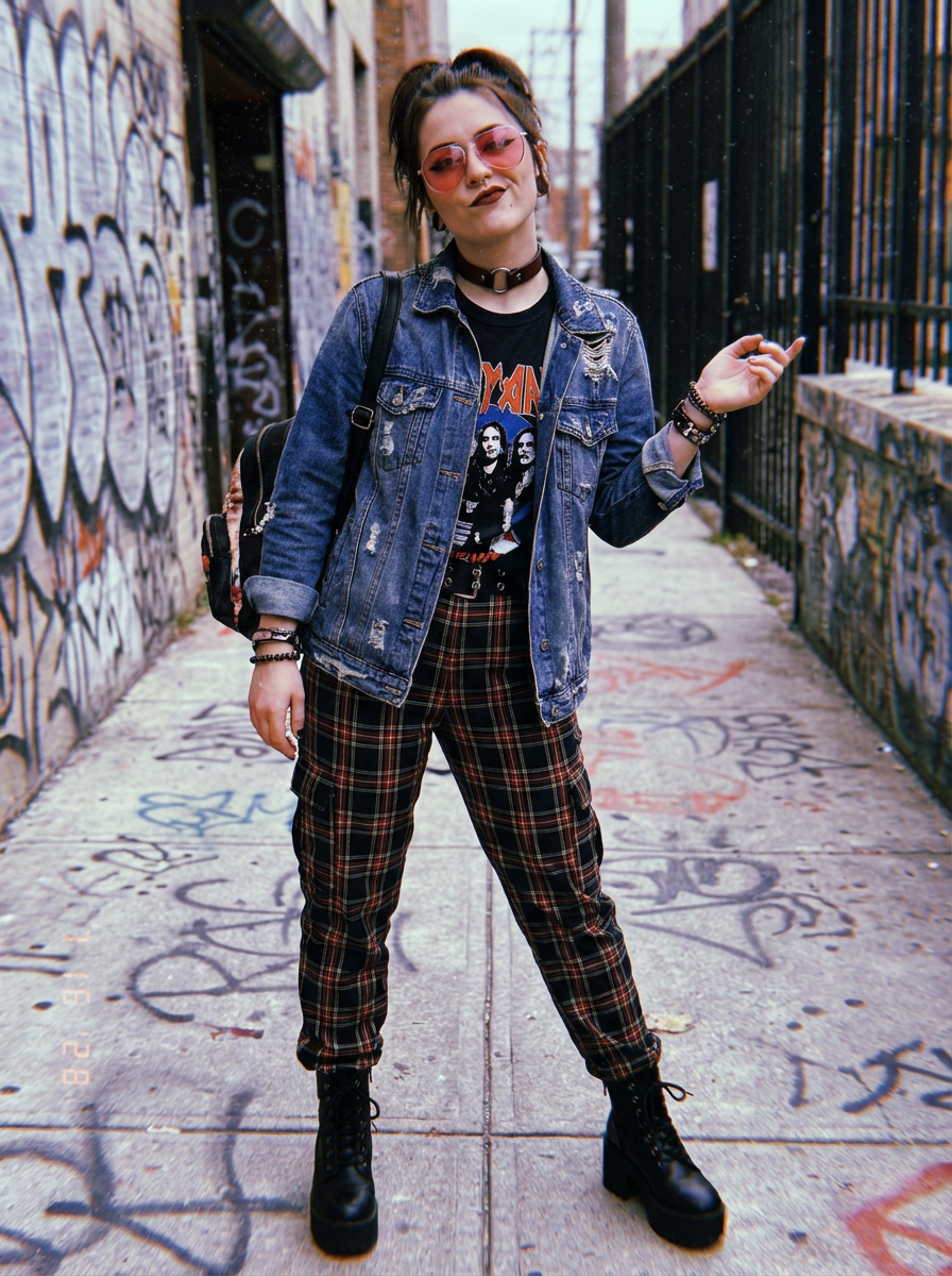 Model with alternative fashion, edgy attitude, street photography vibes. Pink-tinted glasses, dark choker, expressive pose . TikTok and Instagram style.