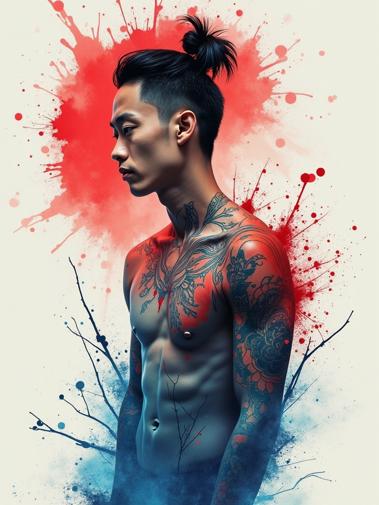Model with an abstract watercolor tattoos. Bold splashes of red and blue ink, unique brushstroke effects. Experimental tattoo art.
