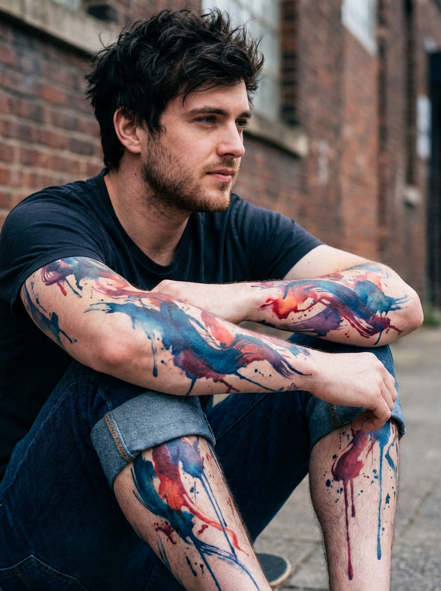 Model with an abstract watercolor tattoos. Bold splashes of red and blue ink, unique brushstroke effects. Experimental tattoo art.