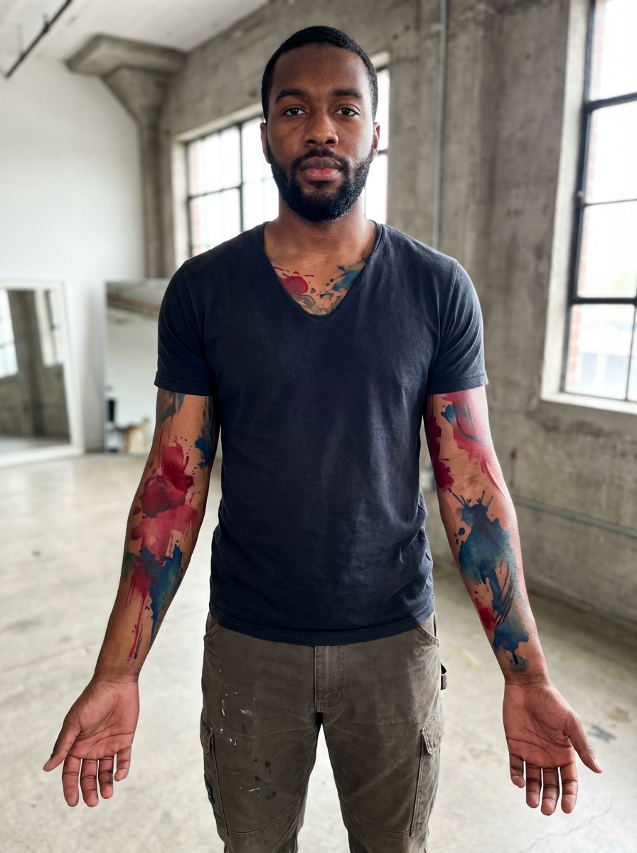 Model with an abstract watercolor tattoos. Bold splashes of red and blue ink, unique brushstroke effects. Experimental tattoo art.