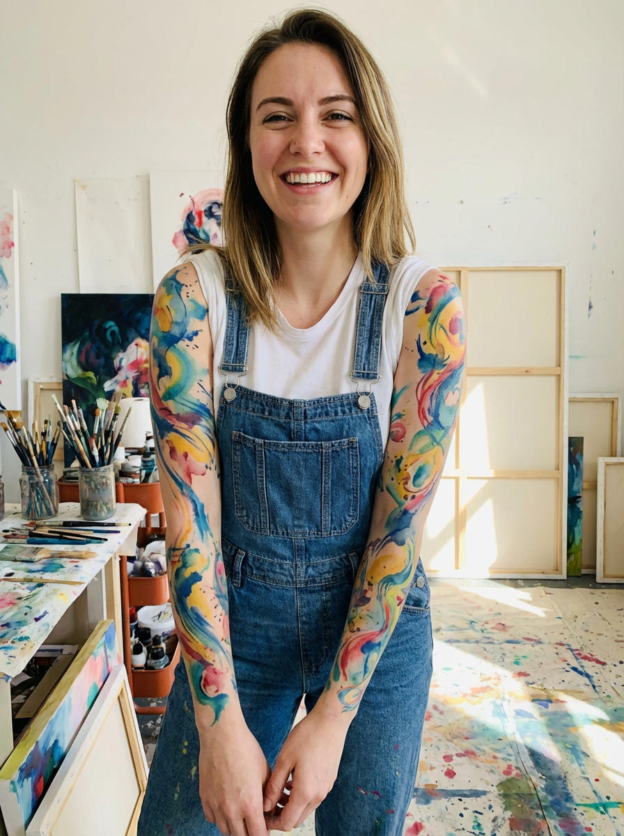 Model with an abstract watercolor tattoos. Brightly colored abstract tattoos on arms and shoulders . Experimental tattoo art.