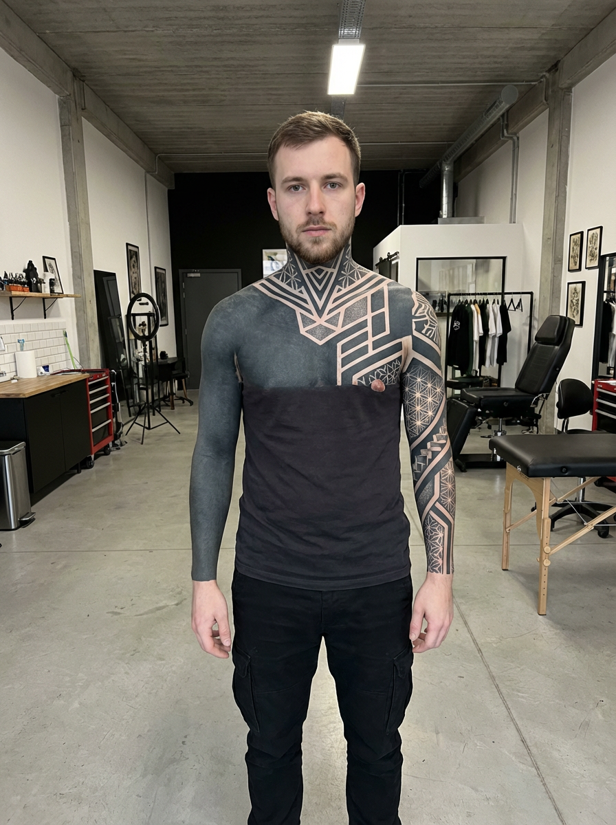 Model with blackout tattoos and bold geometric designs. Full geometric blackout arm piece, modern body art. Extreme tattoo style.