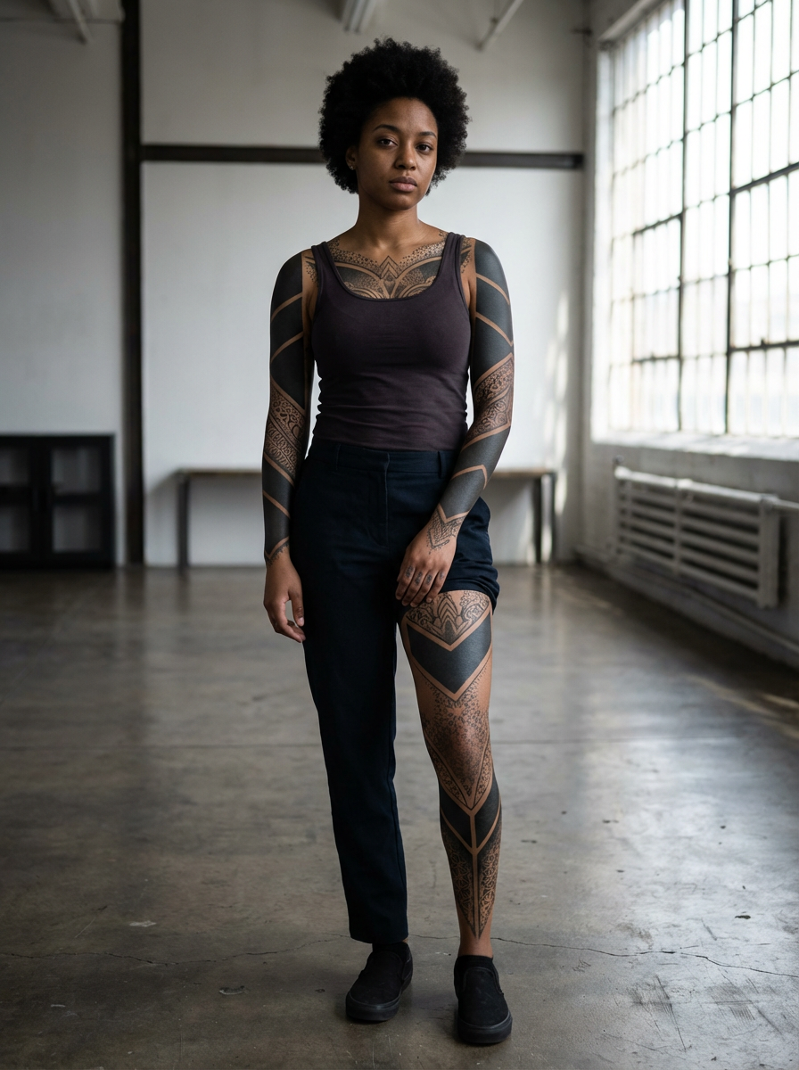 Model with blackout tattoos and bold geometric designs. Sharp blacked-out sections mixed with delicate fine-line details . Extreme tattoo style.