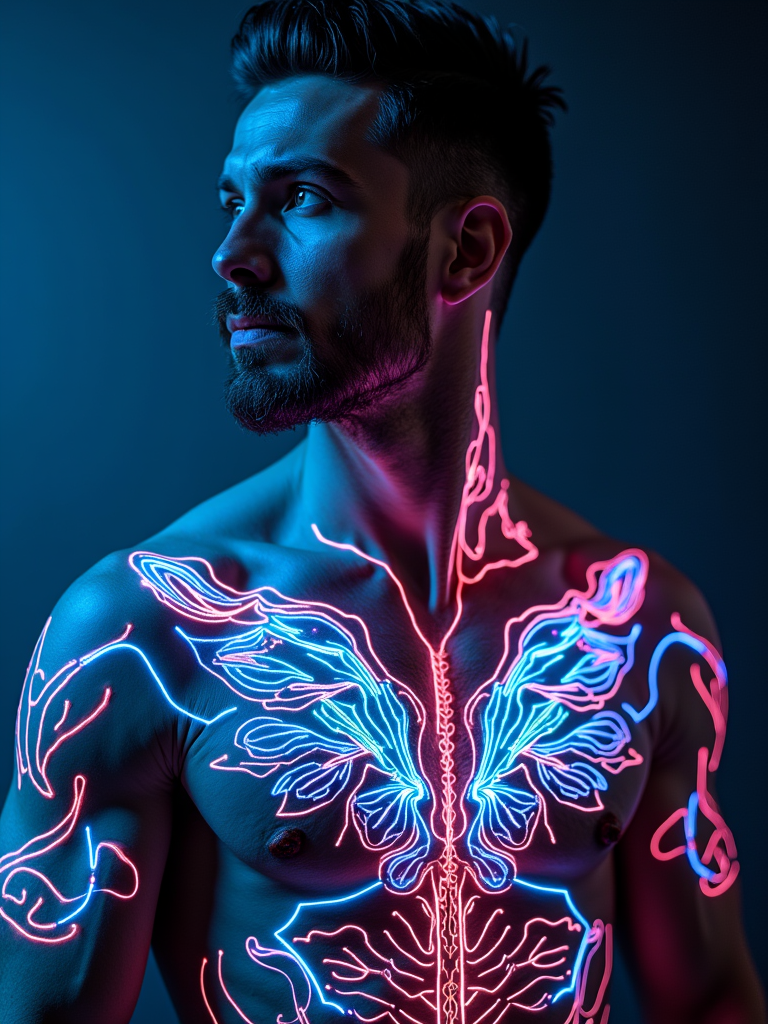 Model with glowing UV ink tattoos. Cyberpunk neon ink details, futuristic body art. Sci-fi-inspired tattoos.