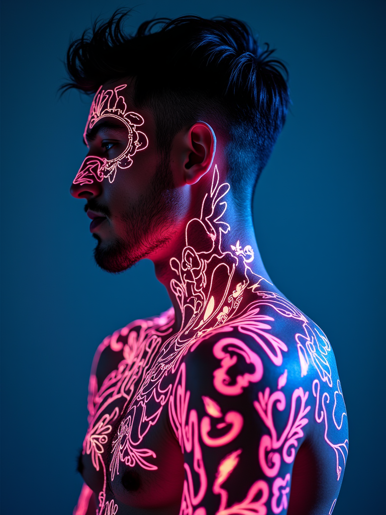 Model with glowing UV ink tattoos. Cyberpunk neon ink details, futuristic body art. Sci-fi-inspired tattoos.