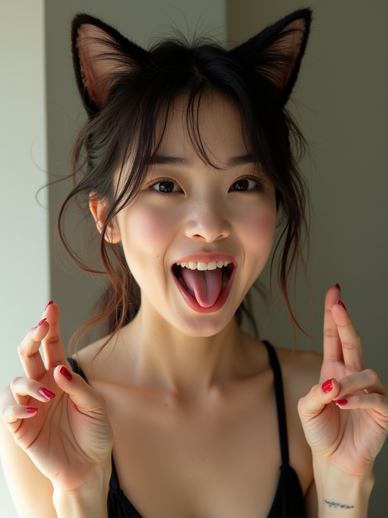 Model with playful catgirl attitude, cute photography vibes. Cat ears, tail visible, playful pose with paw hands . Bright cheerful lighting. The person appears to be sticking out their tongue in a playful or edgy expression.
