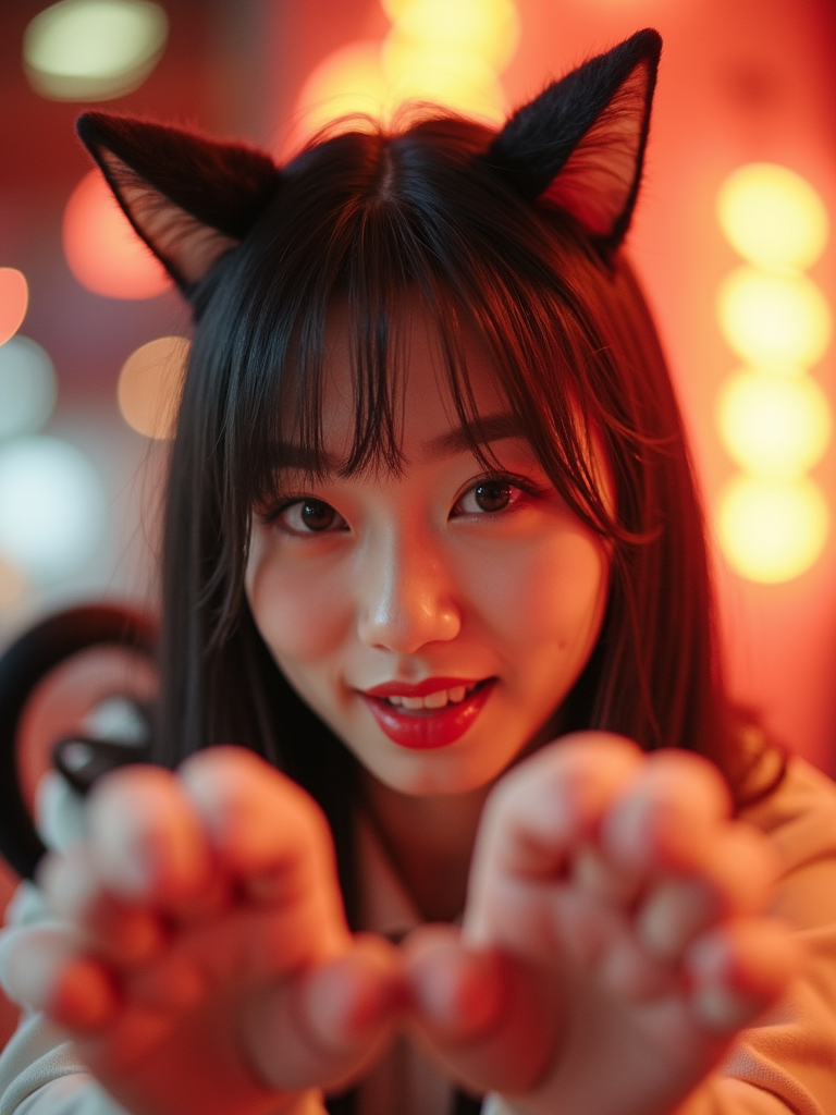 Model with playful catgirl attitude, cute photography vibes. Cat ears, tail visible, playful pose with paw hands . Bright cheerful lighting. The person appears to be sticking out their tongue in a playful or edgy expression.