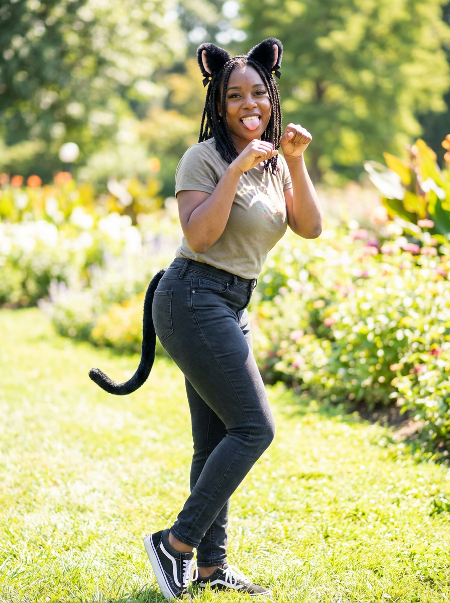 Model with playful catgirl attitude, cute photography vibes. Cat ears, tail visible, playful pose with paw hands . Bright cheerful lighting. The person appears to be sticking out their tongue in a playful or edgy expression.