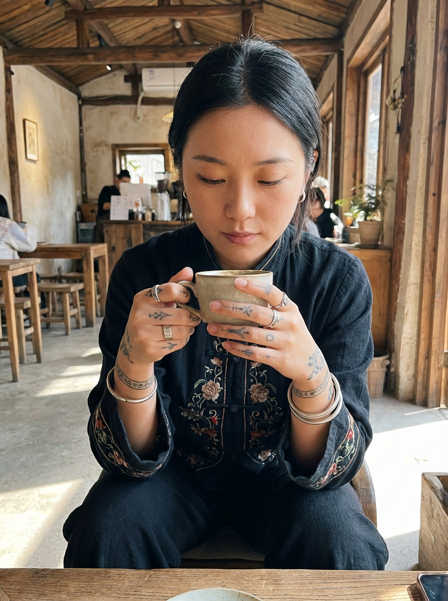 Model with tattooed hands, detailed close-up. Delicate finger tattoos, jewelry accents . High-quality tattoo reference.