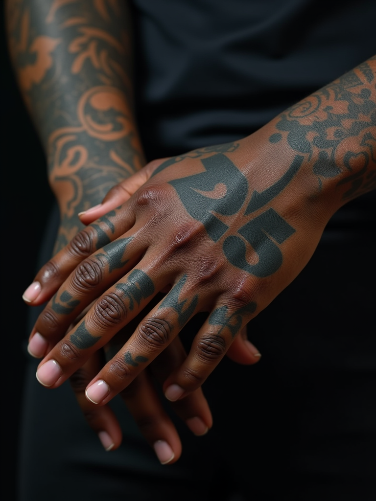 Model with tattooed hands, detailed close-up. Masculine hand tattoos, sharp detailing. High-quality tattoo reference.