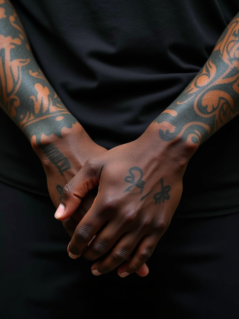 Model with tattooed hands, detailed close-up. Masculine hand tattoos, sharp detailing. High-quality tattoo reference.