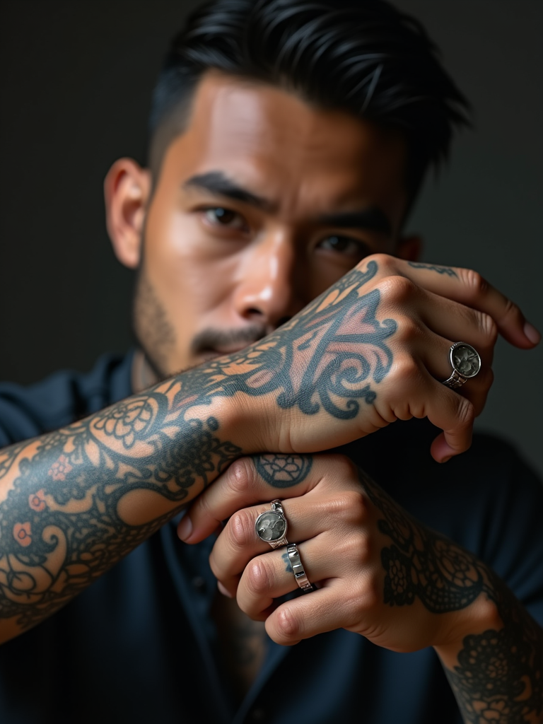 Model with tattooed hands, detailed close-up. Masculine hand tattoos, sharp detailing. High-quality tattoo reference.