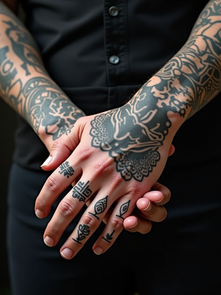 Model with tattooed hands, detailed close-up. Masculine hand tattoos, sharp detailing. High-quality tattoo reference.