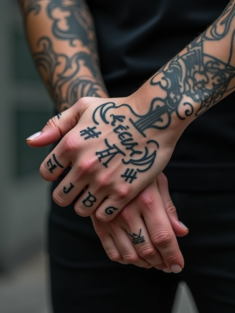 Model with tattooed knuckles and fingers, statement ink. Bold single-letter knuckle tattoos, impactful look. Street-style photography.