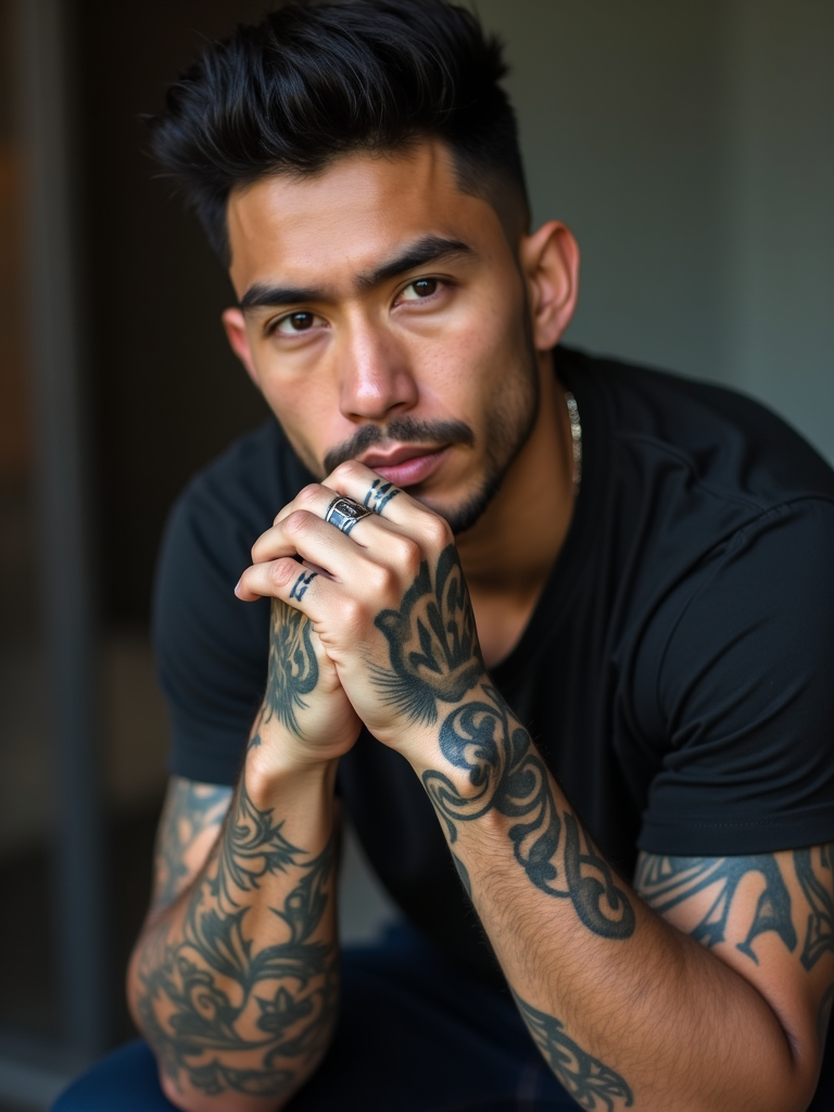 Model with tattooed knuckles and fingers, statement ink. Bold single-letter knuckle tattoos, impactful look. Street-style photography.