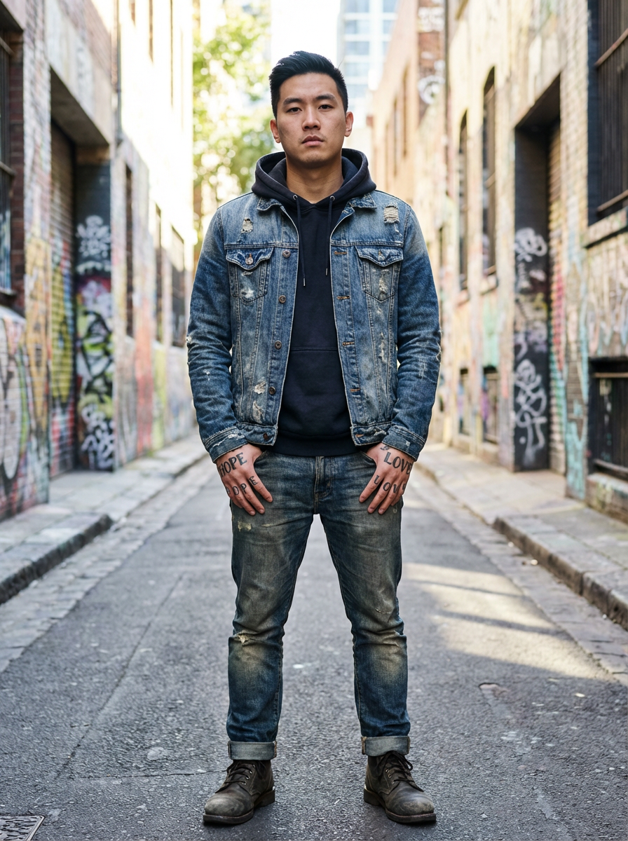 Model with tattooed knuckles and fingers, statement ink. Bold single-letter knuckle tattoos, impactful look. Street-style photography.