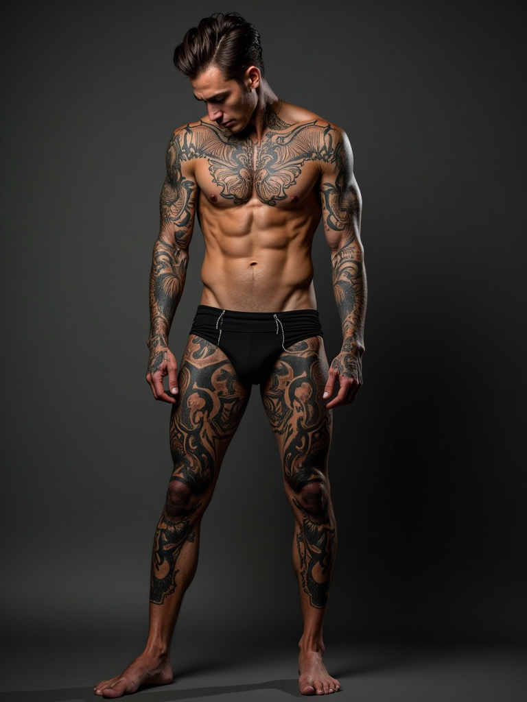 Model with tattooed legs and thighs, bold designs. Dark tribal design covering the shin, aggressive aesthetics. Artistic photography.