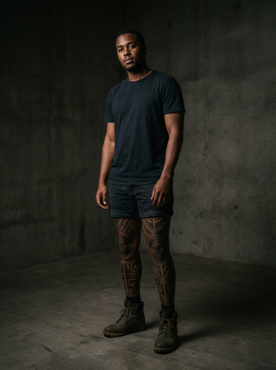 Model with tattooed legs and thighs, bold designs. Dark tribal design covering the shin, aggressive aesthetics. Artistic photography.