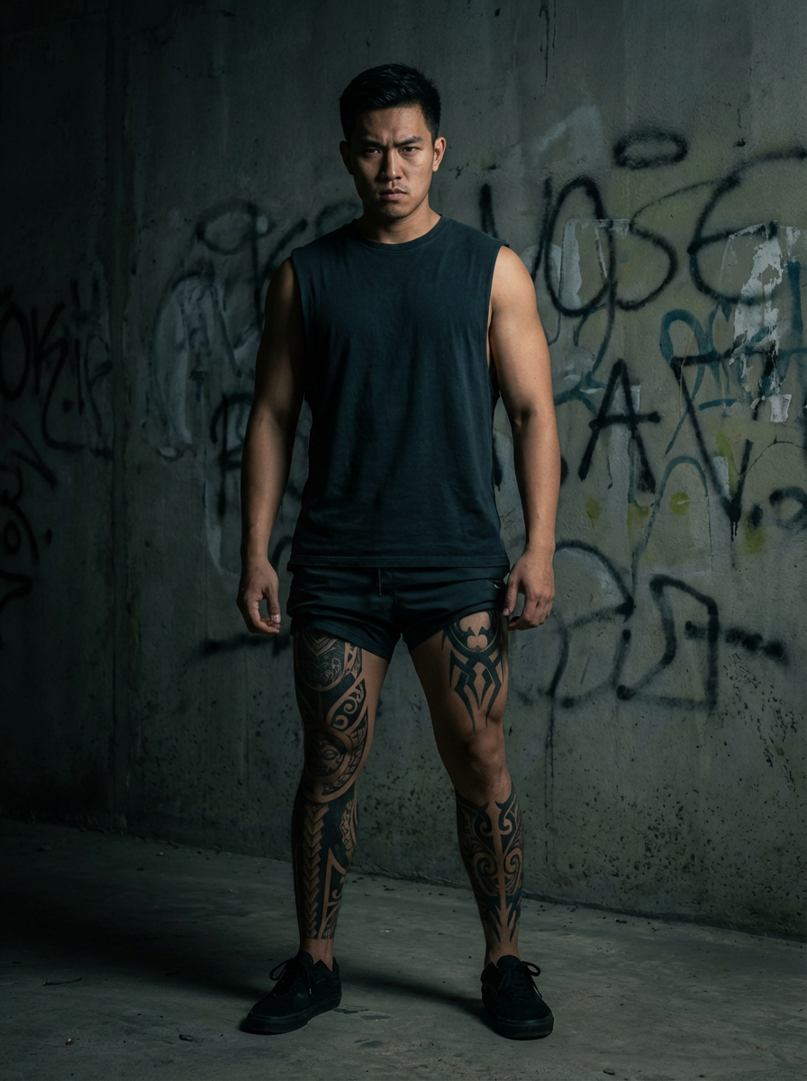 Model with tattooed legs and thighs, bold designs. Dark tribal design covering the shin, aggressive aesthetics. Artistic photography.