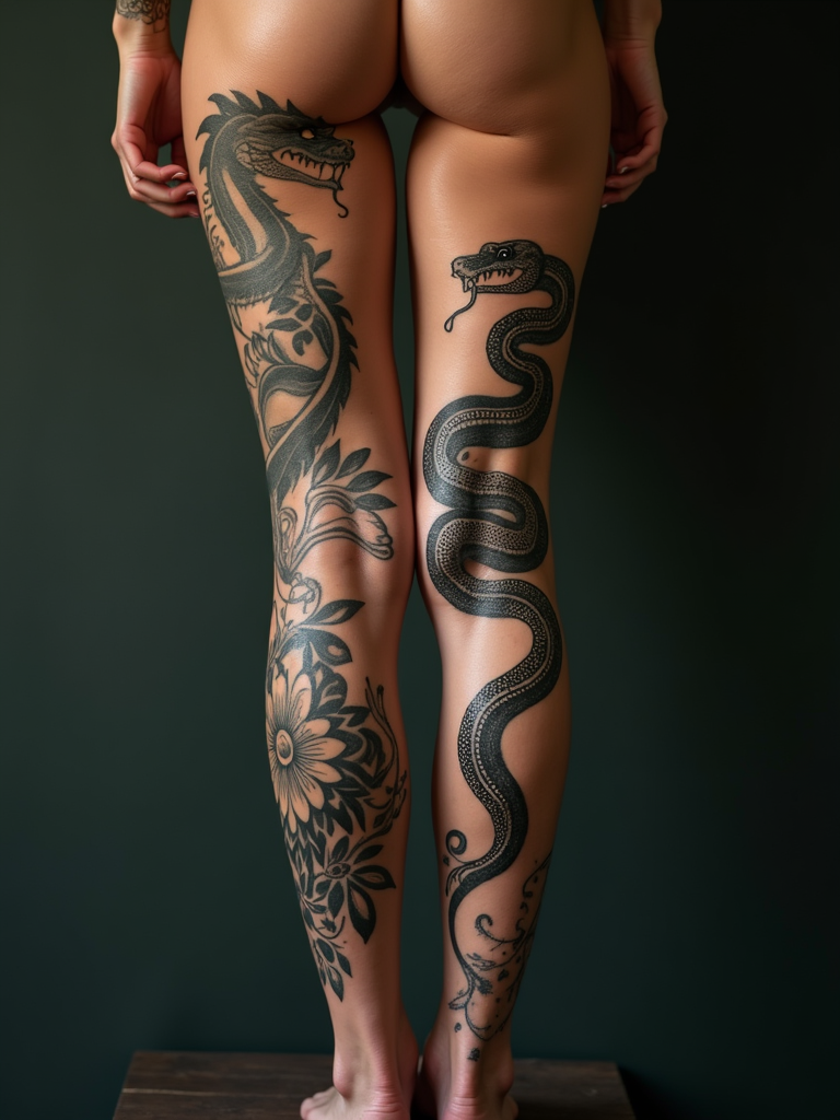 Model with tattooed legs and thighs, bold designs. Snake wrapping around the thigh, elegant and powerful . Artistic photography.