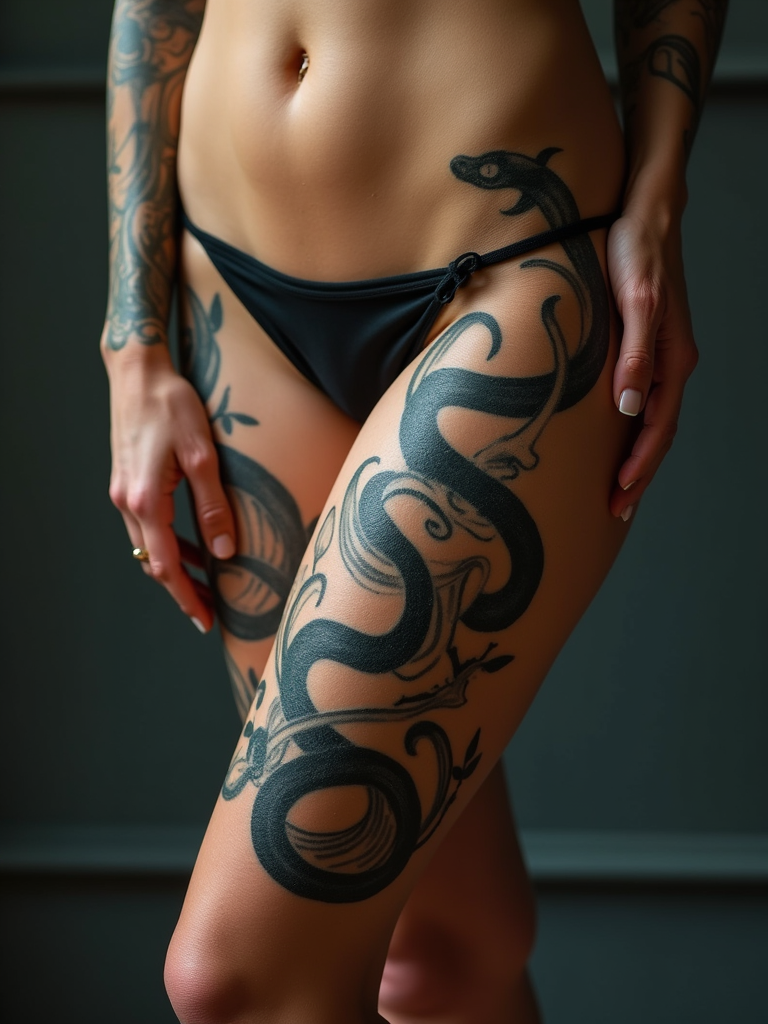 Model with tattooed legs and thighs, bold designs. Snake wrapping around the thigh, elegant and powerful . Artistic photography.