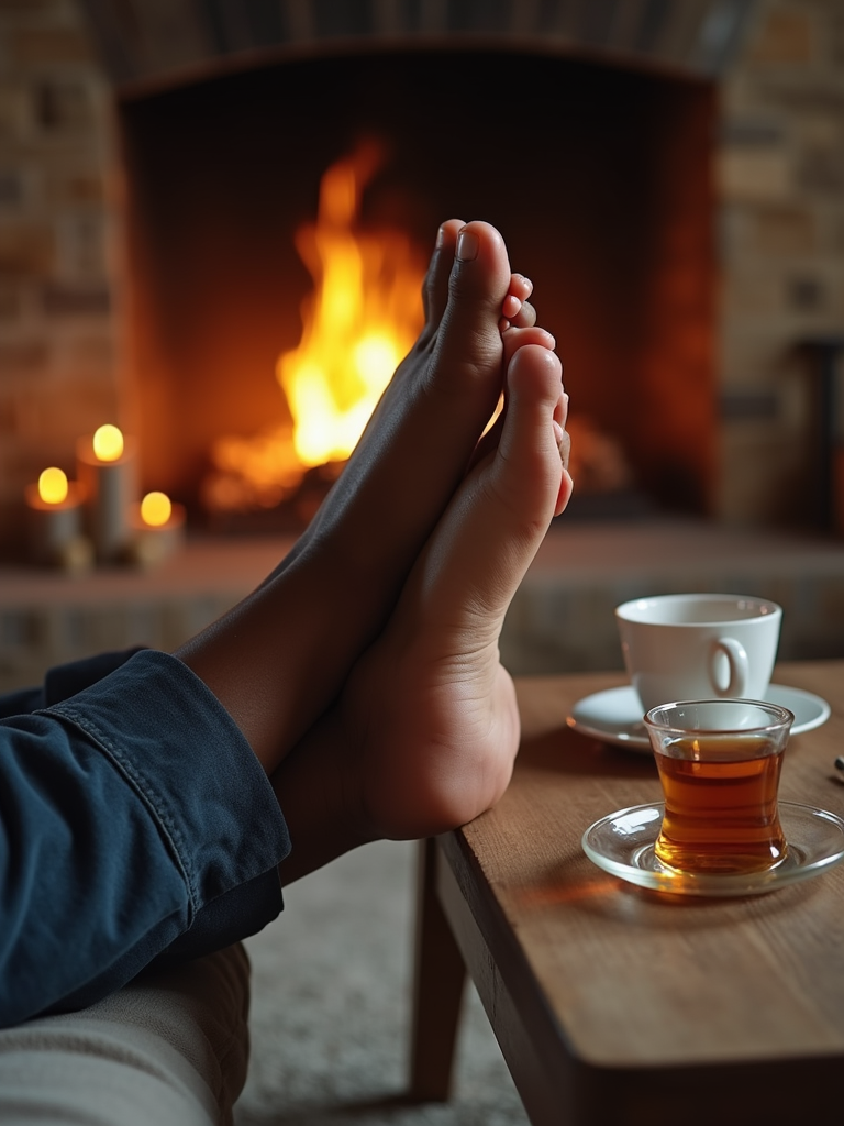 Model's bare feet, propped up on a coffee table, with a fireplace and a warm cup of tea in the background, also showing the bottom of feet.
