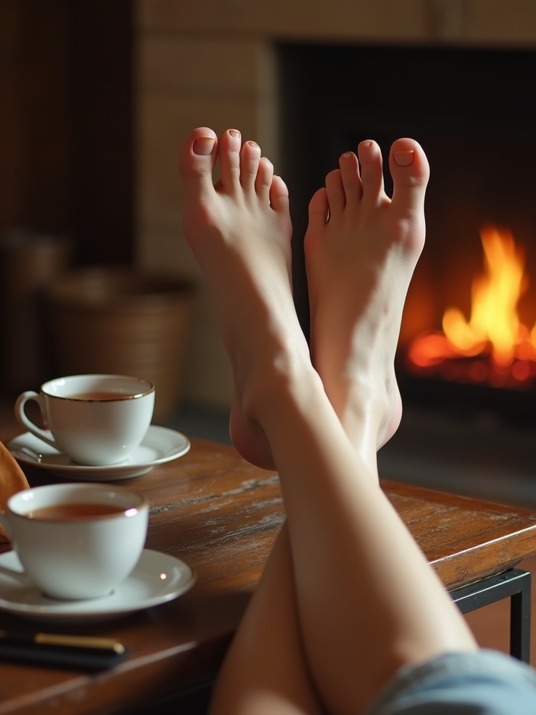 Model's bare feet, propped up on a coffee table, with a fireplace and a warm cup of tea in the background, also showing the bottom of feet.