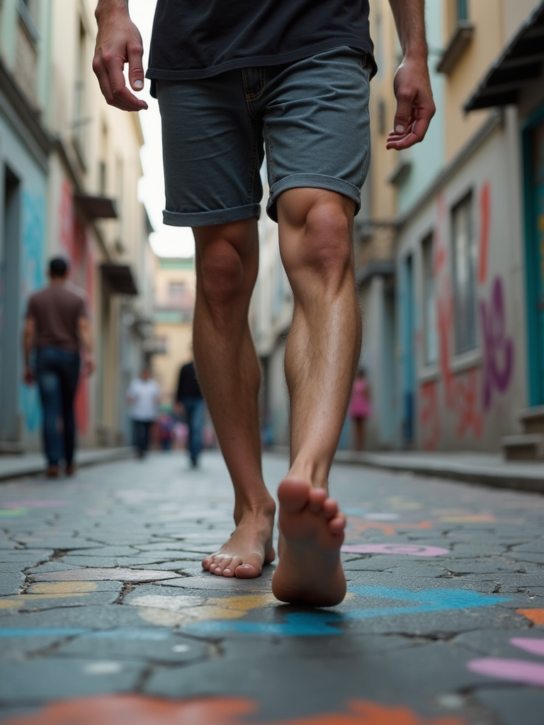 Model's bare feet, walking on a graffiti-covered urban street, capturing the essence of city life, also showing the bottom of feet.